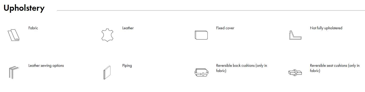 本款沙發可選擇布料或皮革面料, 原廠提供數百款歐盟認證頂級家具專用面料供 Furninova 客戶進行客製化打造專屬您的理想沙發; 歡迎向我們洽詢了解不同面料特性。