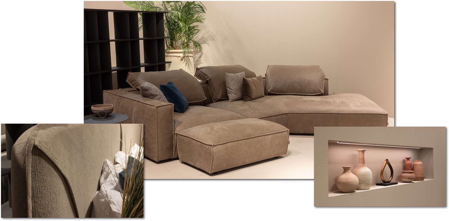 展場上更展示了多款2024新品, 原廠設計師汲取自然界鵝卵石、小島、虎鯨等有機線條與各大文化古城的建築元素為靈感來源, 將窗外的景色引入居家空間, 給予自然與歷史人文價值應得的關注與深韻。今年原廠更針對系列新品進行坐感配方再優化、坐深加大設計, 透過方寸之間精密的調整, 讓沙發使用者達到最極致的休憩體驗。
