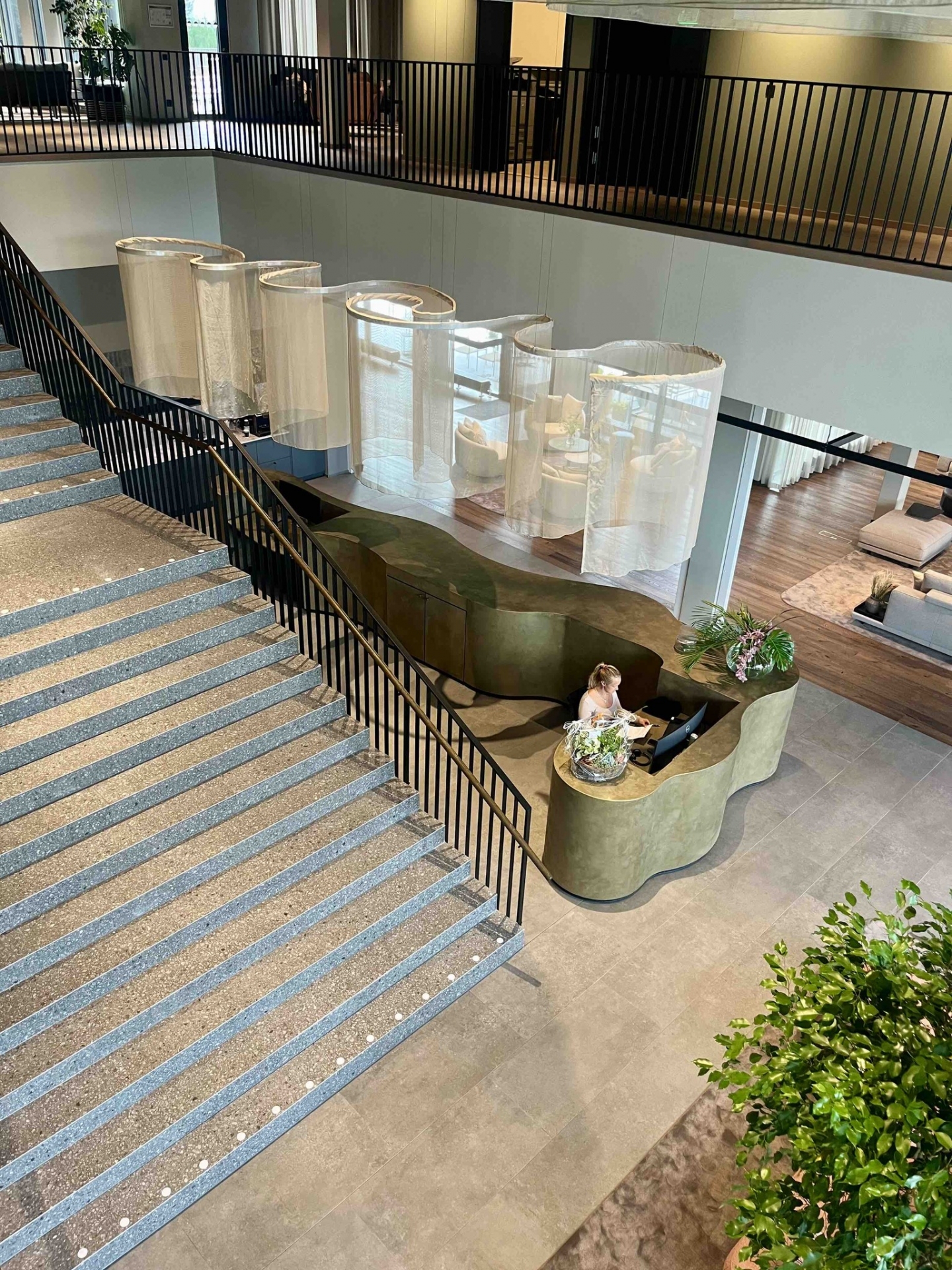 進入HQ, 首先映入眼簾的除了充滿北歐慵懶風情的家具展間, 是精心採取自然流動廓型的接待櫃台以及寬敞大氣的台階。這道階梯歡迎每位來到HQ的貴客自在拾級而上、層層遞進, 讓舒適且光線充足的室內工作環境映入眼簾, 同時能順應步調發現自然存在於各個角落的精緻家具、家飾. 全身心沉浸體驗品牌的瑞典生活哲學。