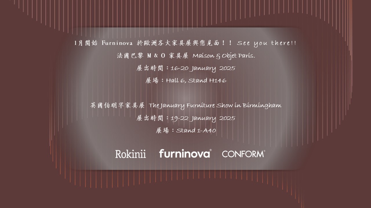 #法國巴黎家具展 #英國伯明罕家具展 #歐洲原裝進口 2025將至, 新的一年, 經典北歐家居品牌 Furninova 將隨著 法國巴黎M&O家具展 與 英國伯明罕家具 展盛大展開與各位見面。 居於台灣的您無須遺憾錯過本屆展覽, Rokinii 羅奇尼家居 位於台中著名環中路家具大道上, 長年代理 Furninova 品牌, 每年定期自歐洲原裝進口絕美頂級家具, 您可實際至門市體驗, 將由專業軟裝規劃師為您搭配介紹。門市現場展示家具皆為限量選品, 亦可向歐洲原廠定製依您個人喜好挑選相關細節的款式, 歡迎立即至門市參觀體驗。 查看更多