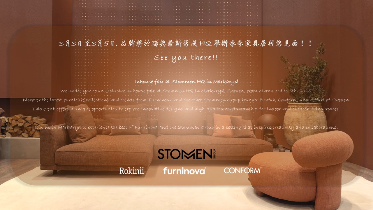 2025開春, 新的一年, 經典北歐家居集團攜旗下沙發品牌 Furninova 與瑞典椅品牌 Conform 將於3月3日至3月5日於去年全新落成之集團HQ盛大舉辦春季家具展與各位見面。