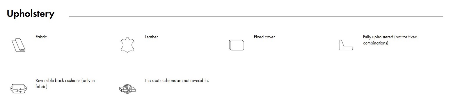 本款沙發可選擇布料或皮革面料, 原廠提供數百款歐盟認證頂級家具專用面料供 Furninova 客戶進行客製化打造專屬您的理想沙發; 歡迎向我們洽詢了解不同面料特性。